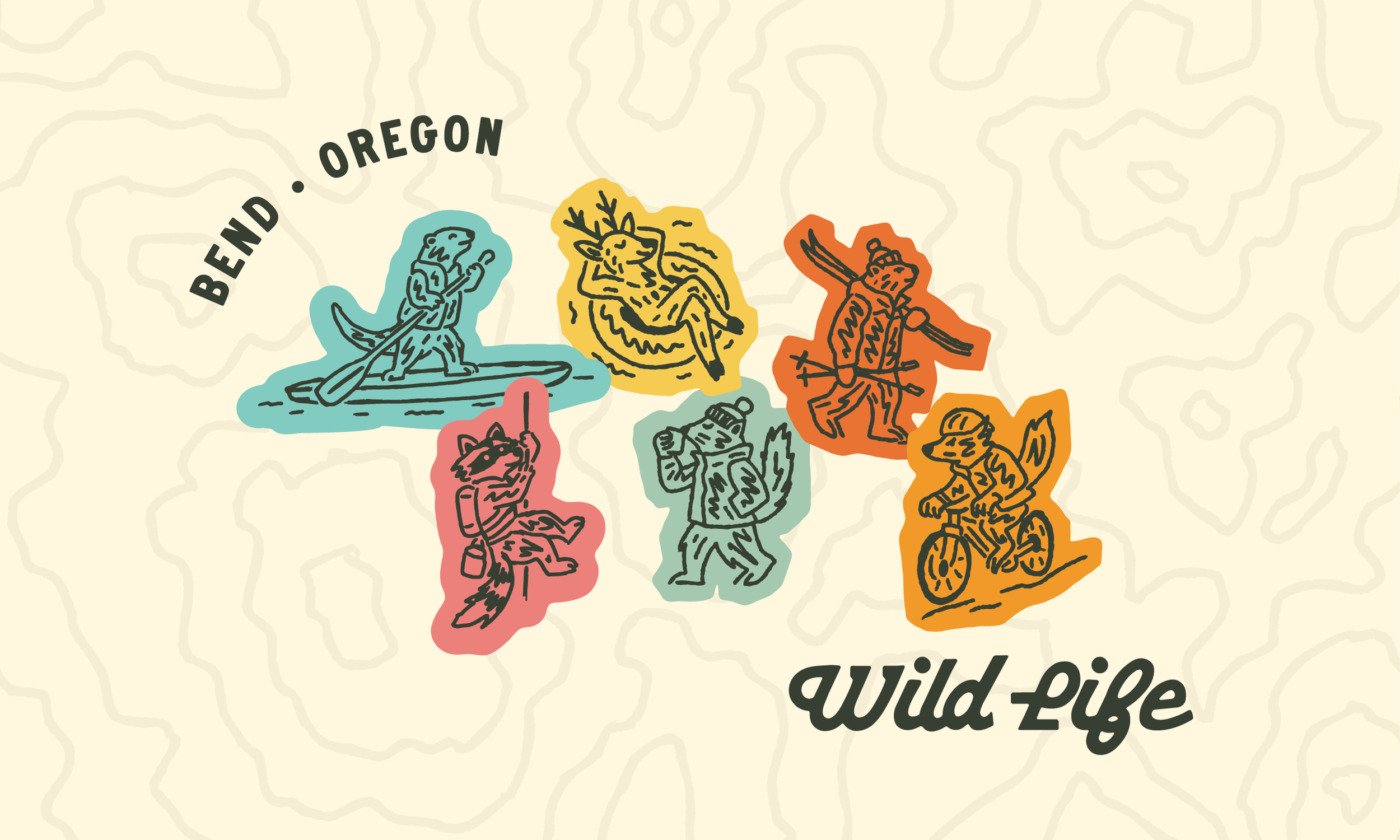 The concept celebrates Bend’s outdoor culture through playful hand-drawn wildlife illustrations—animals reimagined skiing, biking, climbing, paddle boarding, and floating the river. These characters gave the brand personality, storytelling, and a strong sense of place while avoiding expected mountain-town clichés.