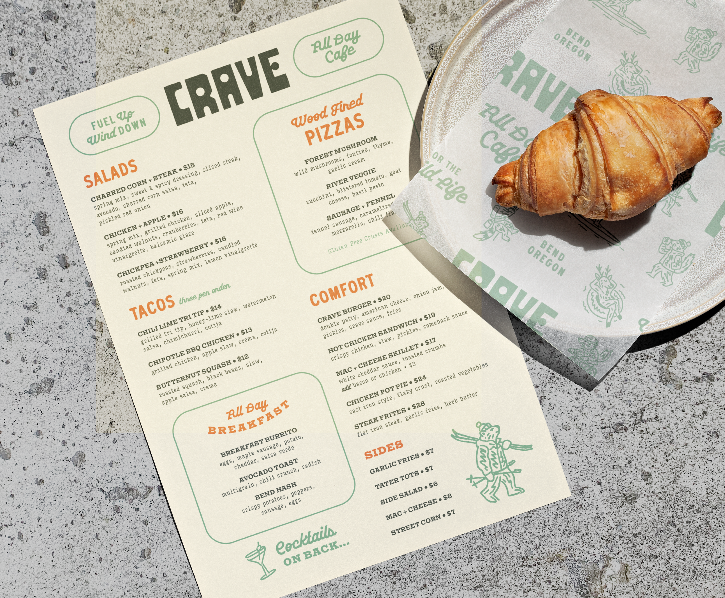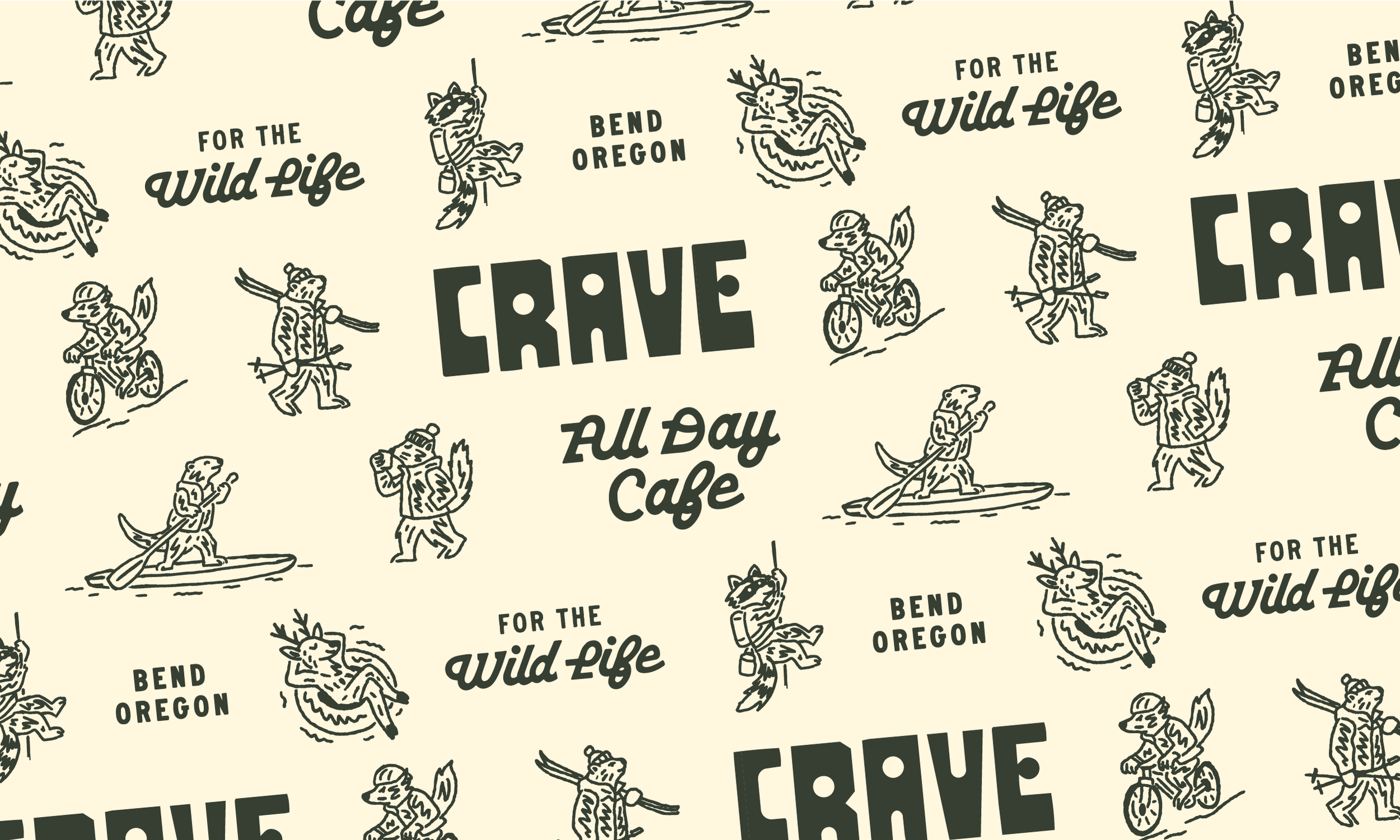 Crave is a self-initiated brand concept for an all-day café inspired by the adventurous rhythm of Bend, Oregon. Created as an exploration in how far a hospitality identity could be pushed, the project imagines a fully realized brand world spanning everything from coffee-fueled mornings to cocktails after sunset.